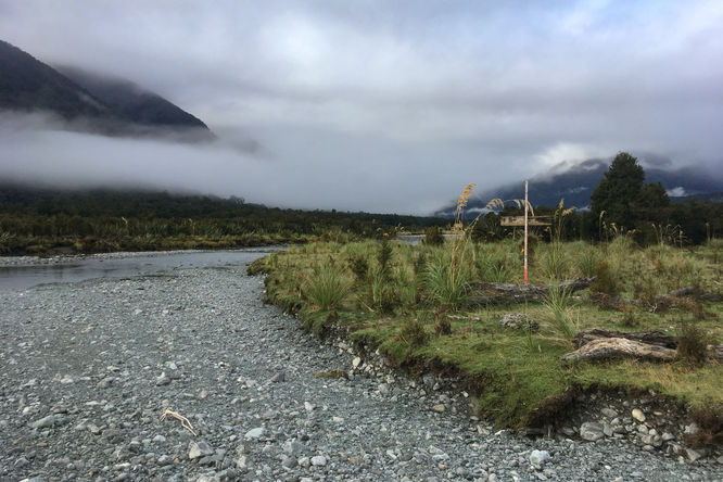 I reached the Pyke River soon after sunrise, the mountains in the mist beyond framing the rainforest canopies that stretched across the valley. Before me lay a clearing of yellow-tinted flax-land. The Garden of Eden the local bushmen called it, and its beauty betrayed the name. A thousand knife blades glinted in the low morning sun, set beside a slow-winding ribbon of many-coloured pebbles. I crossed the clear water in two sections without problem—it was low, knee high at most and slow-flowing—and paused for breakfast on the far bank. Oats and milk powder with fresh cold river water before the sandflies chased me onward.